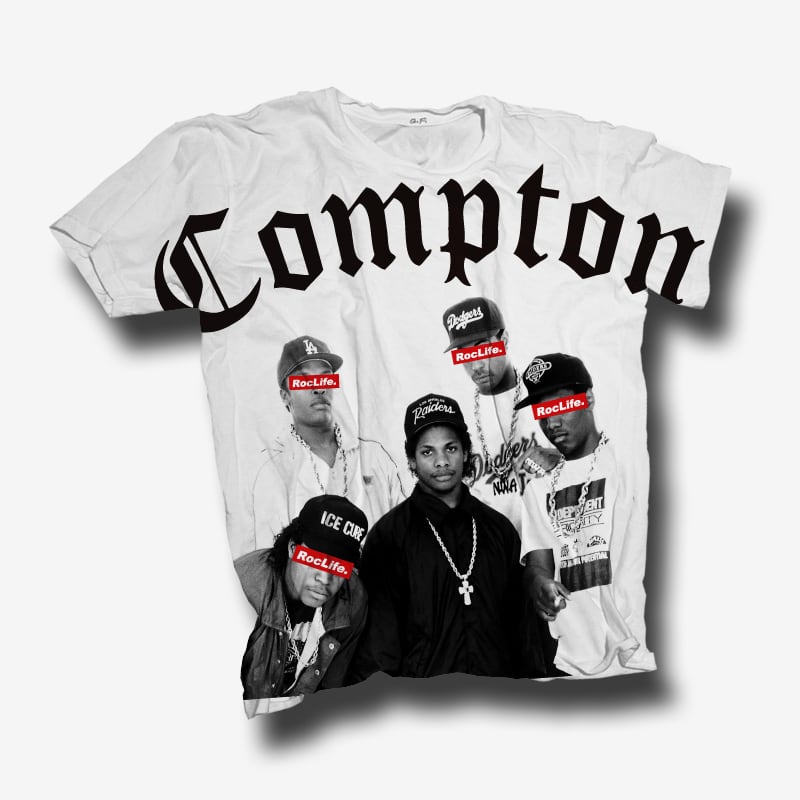 ホワイトボディにN.W.Aと、その地元であるCompton(コンプトン)のロゴを全面にプリントしたTシャツです。